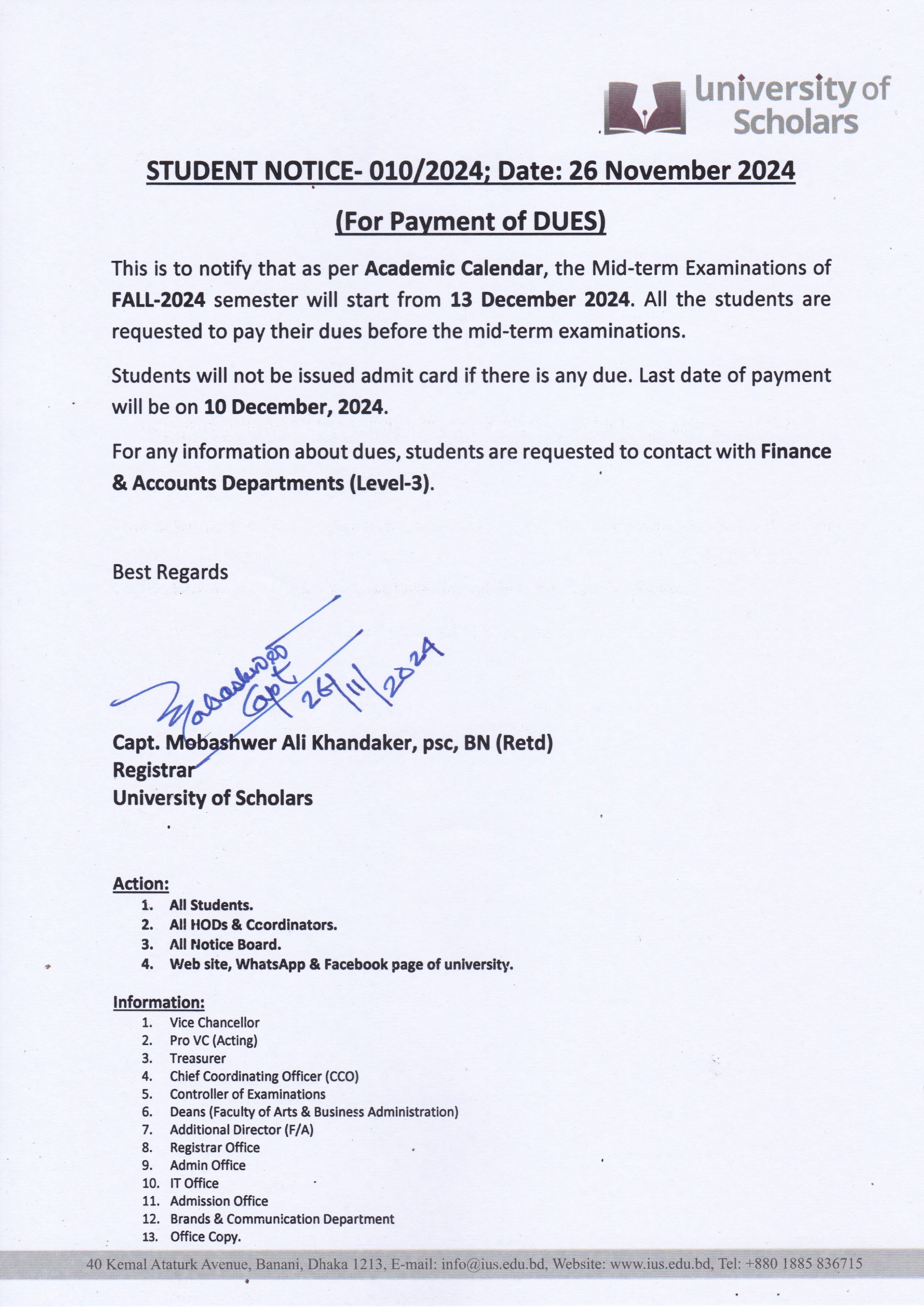 • Student Notice for Payment of DUES