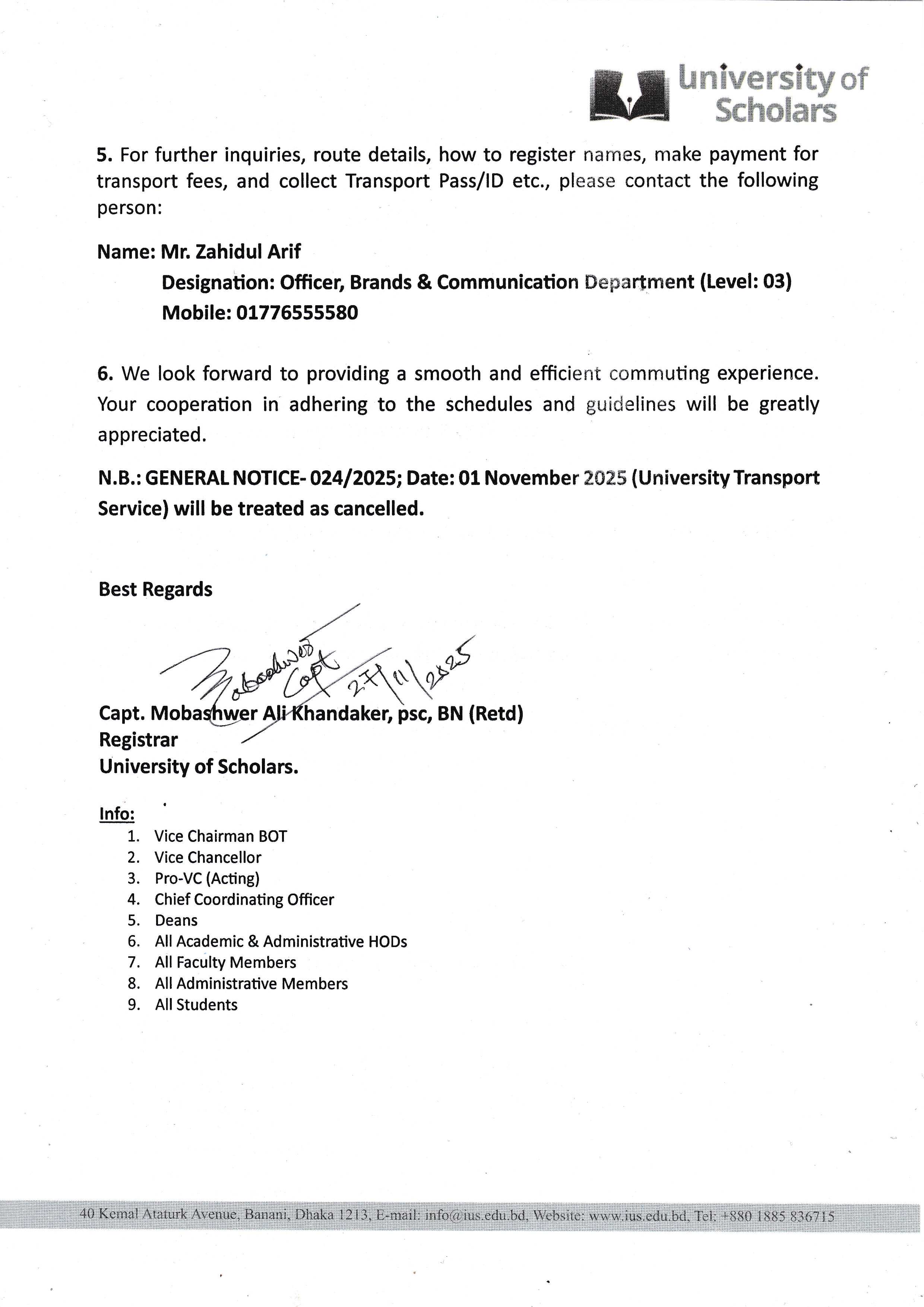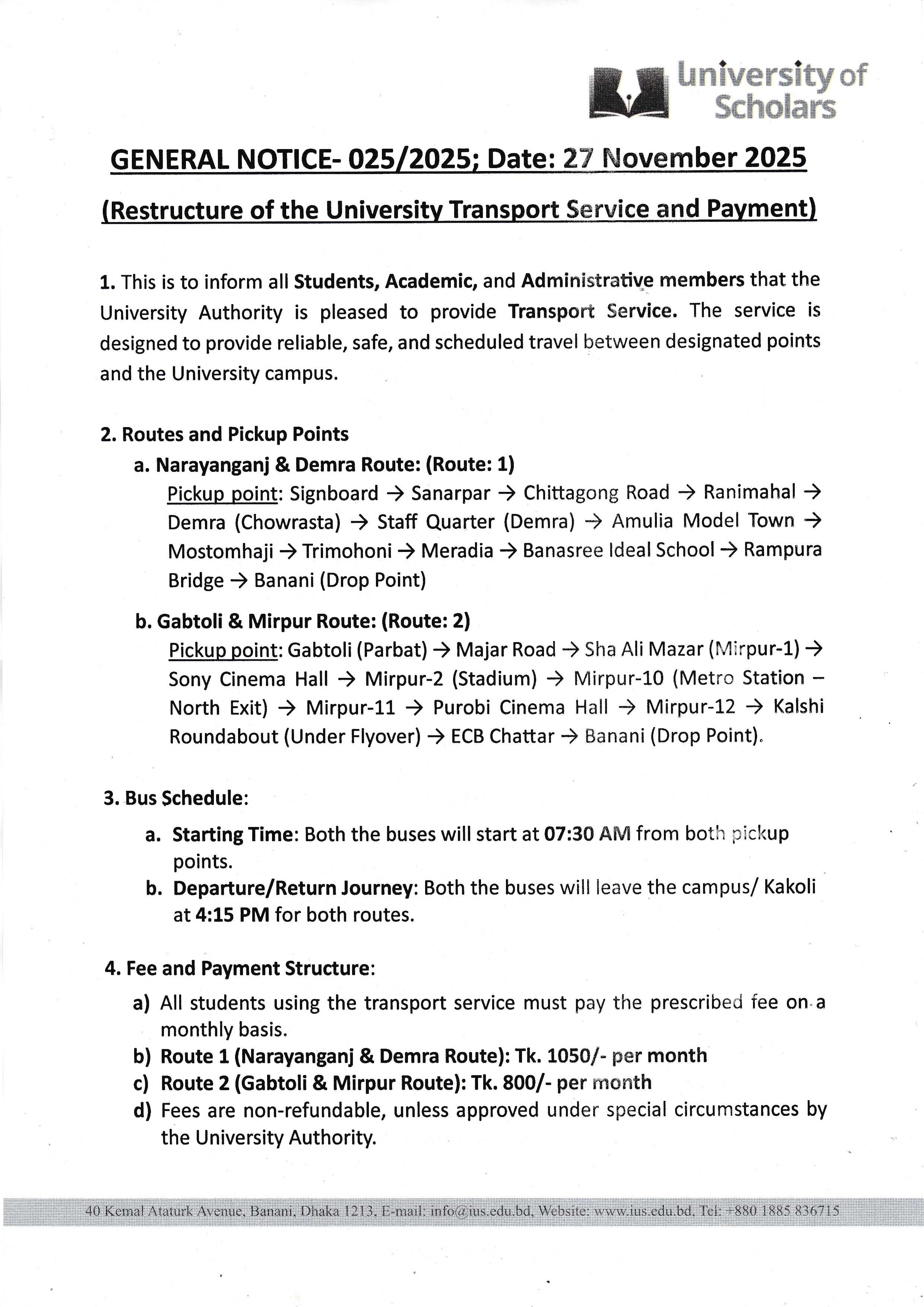 GENERAL NOTICE- Restructure of the University Transport Service and Payment