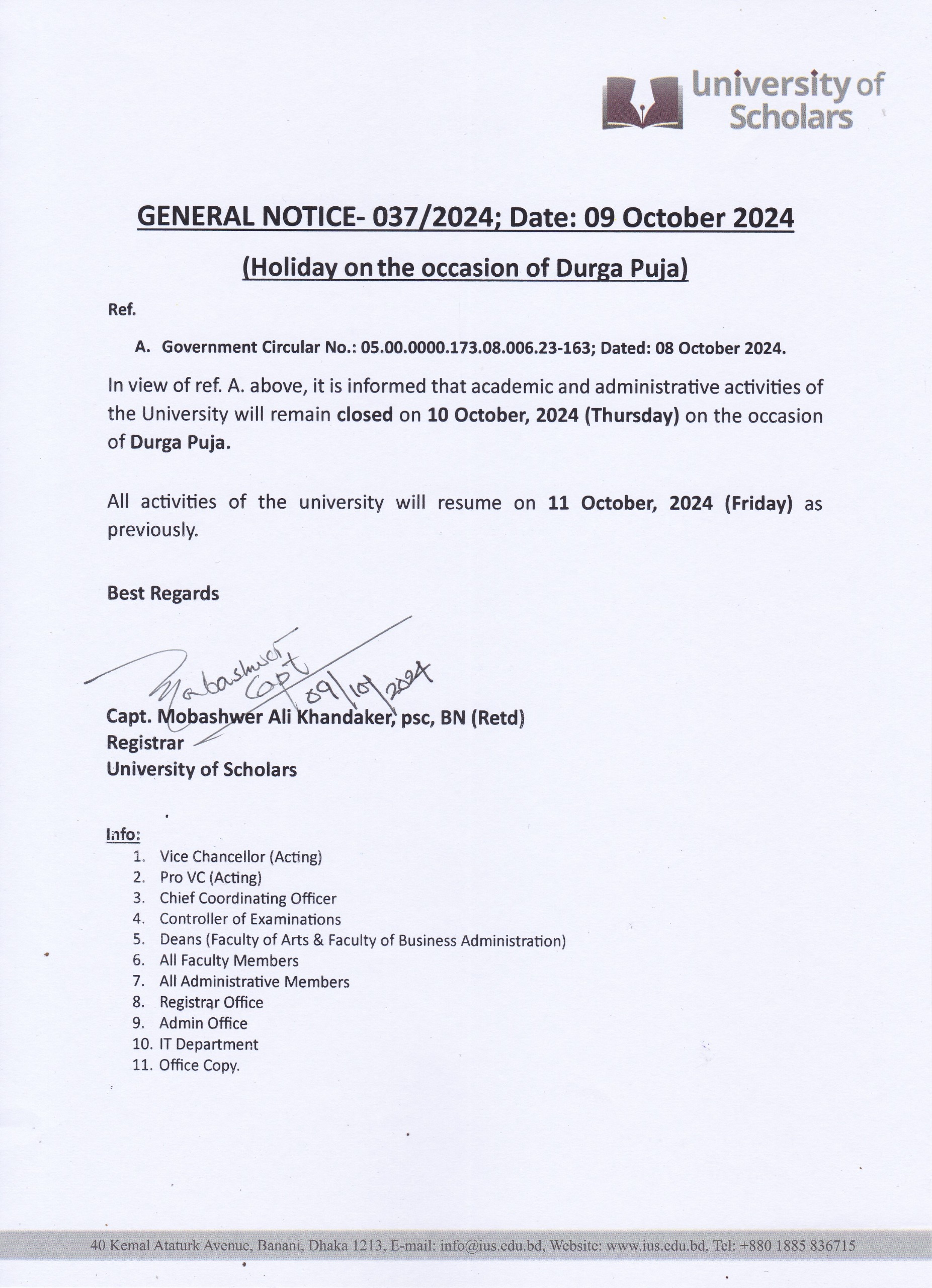 • General Notice for Holiday on the occasion of Durga Puja