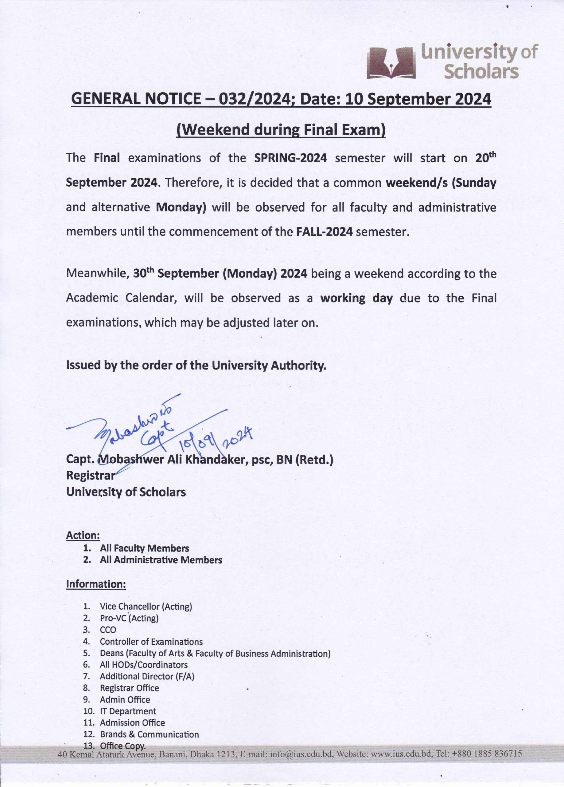 General Notice for Weekend during Final Exam SPRING-2024