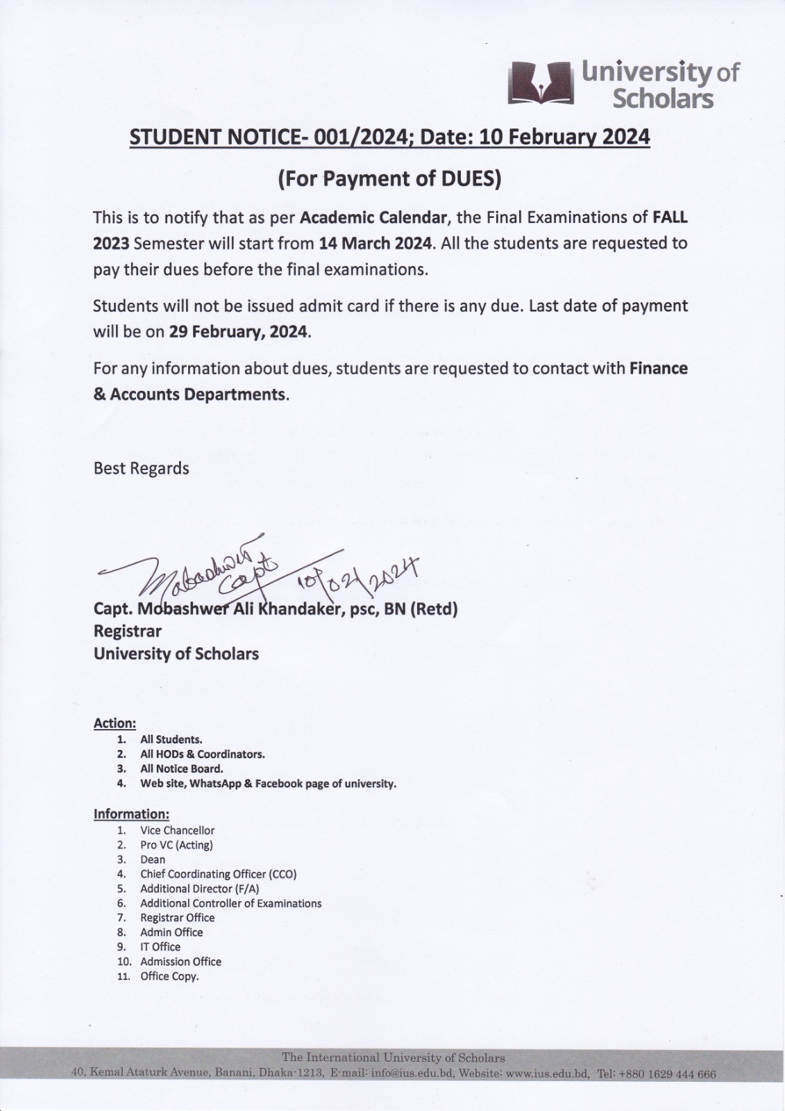 Student Notice For Payment of Dues, 2024